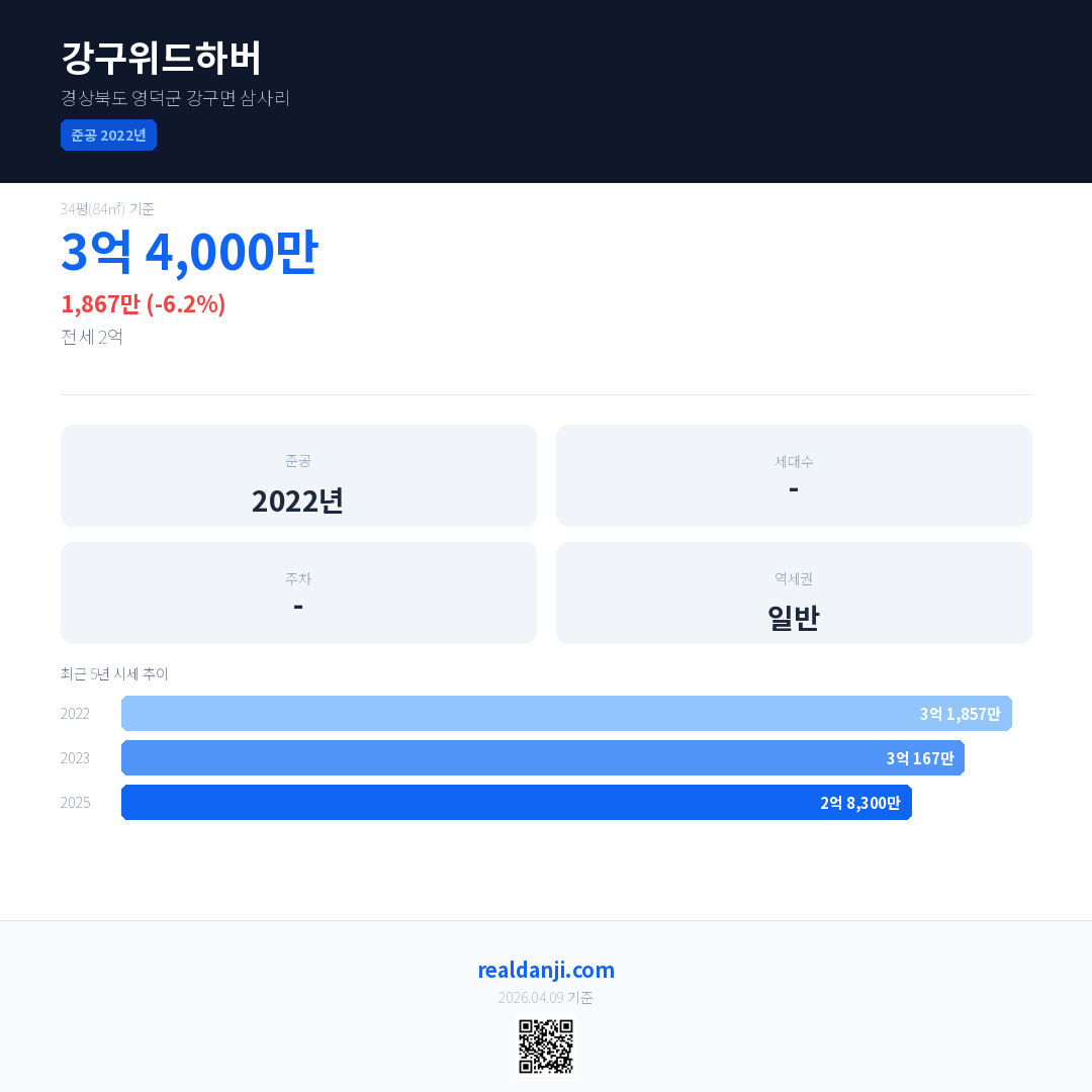 강구위드하버 국민평형 기준 2025년 평균 거래가는 2억 8,300만으로, 전년 대비 6.2% 하락 했습니다.