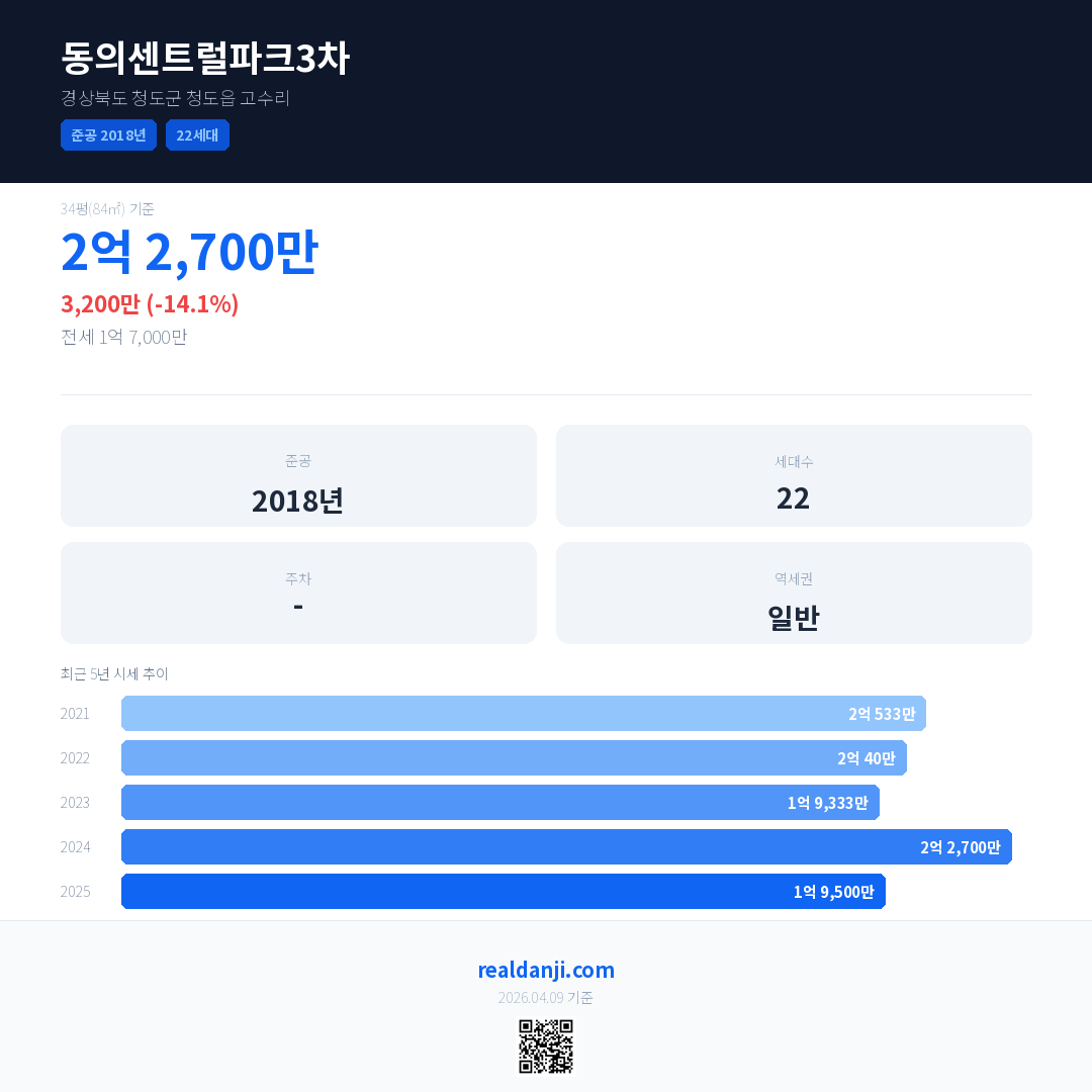 동의센트럴파크3차 국민평형 기준 2025년 평균 거래가는 1억 9,500만으로, 전년 대비 14.1% 하락 했습니다.