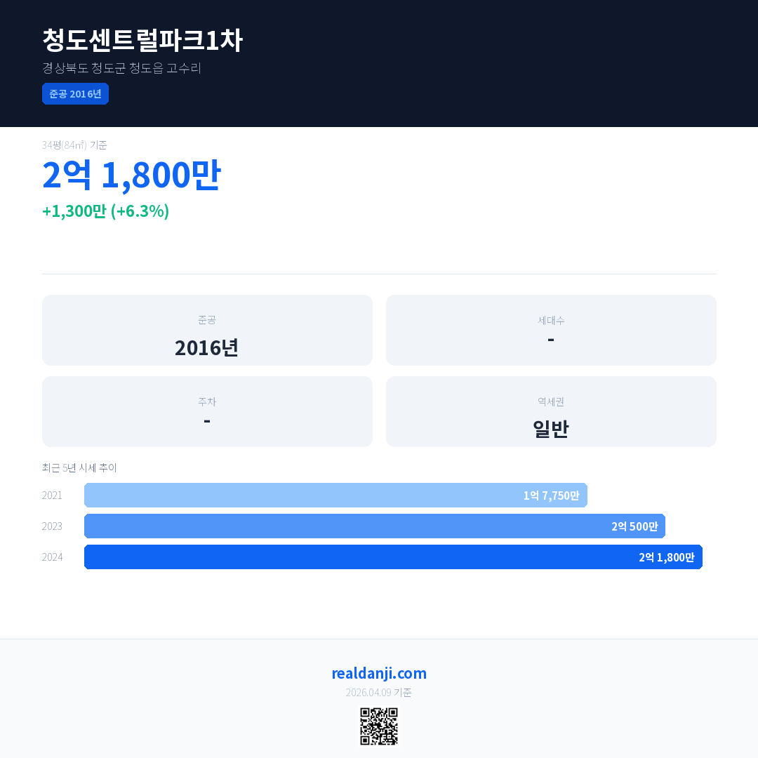 청도센트럴파크1차 최근 거래가는 2억 1,800만입니다. (2024-10)