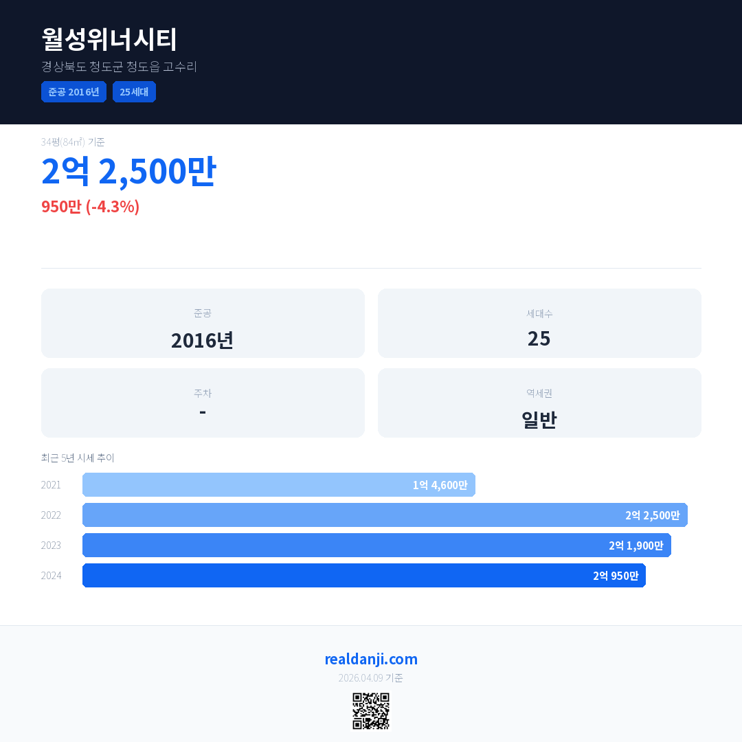 월성위너시티은(는) 2016년에 준공되었으며, 현재 10년차입니다. 총 25세대 규모입니다.