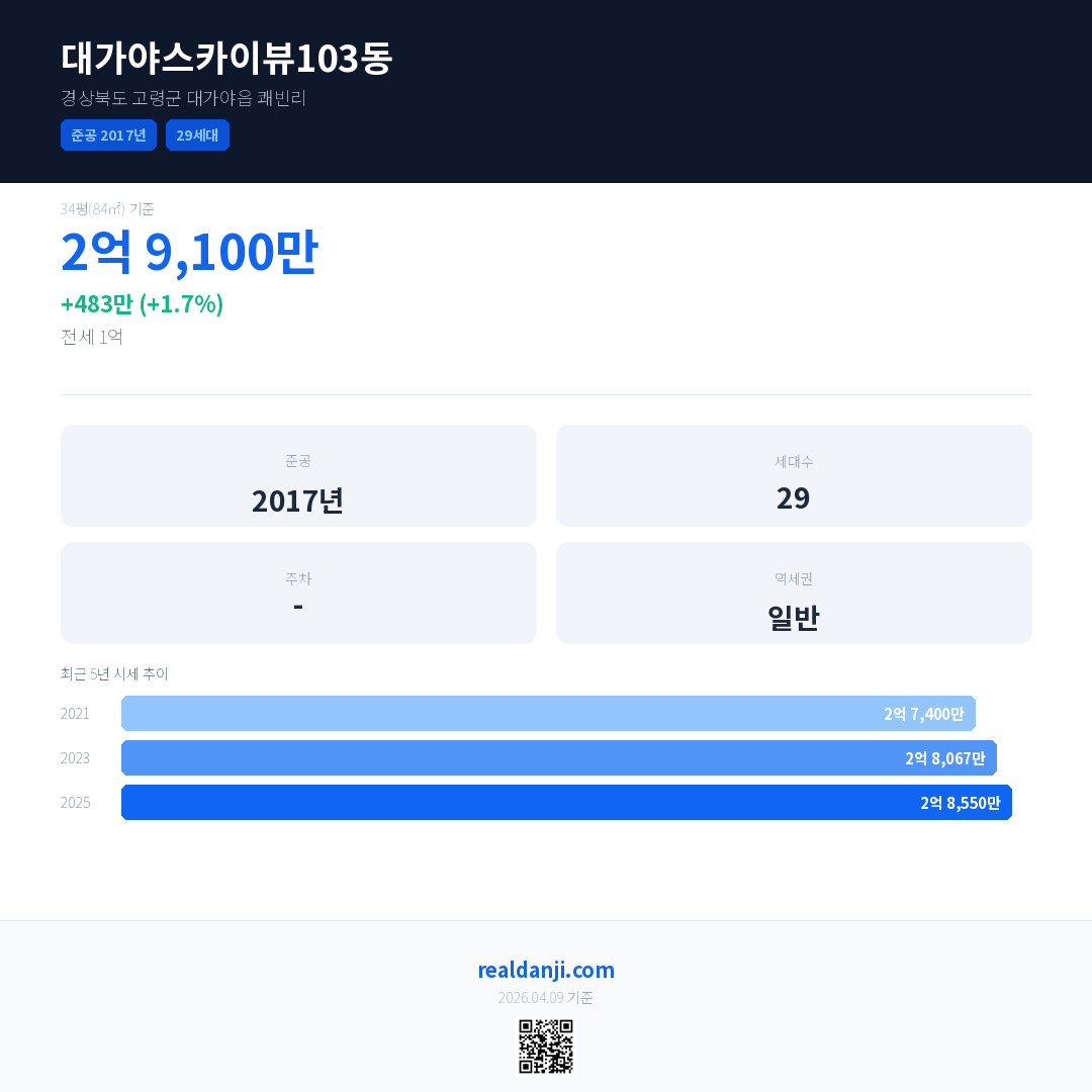 대가야스카이뷰103동 국민평형 기준 2025년 평균 거래가는 2억 8,550만으로, 전년 대비 1.7% 상승 했습니다.