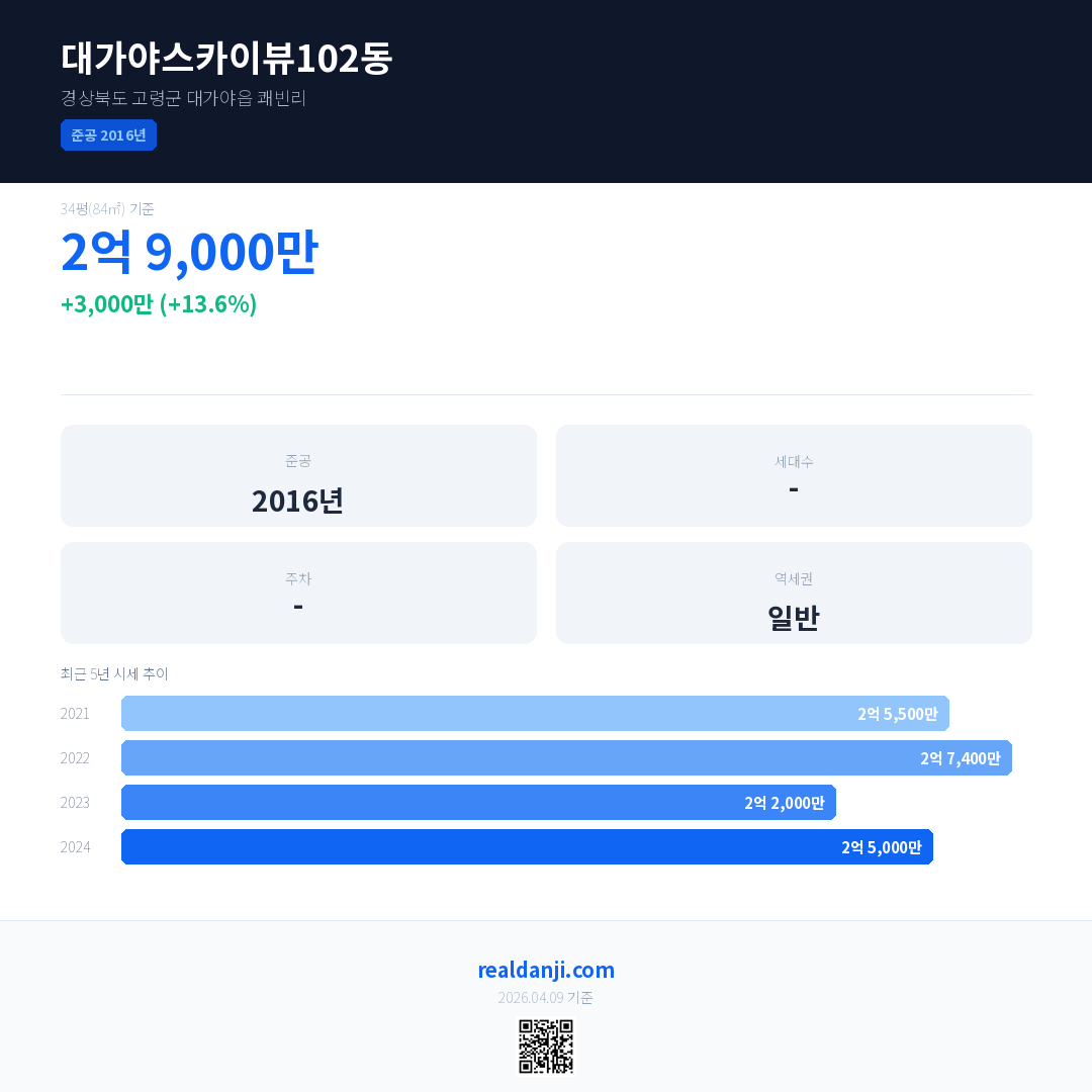대가야스카이뷰102동 국민평형 기준 2024년 평균 거래가는 2억 5,000만으로, 전년 대비 13.6% 상승 했습니다.