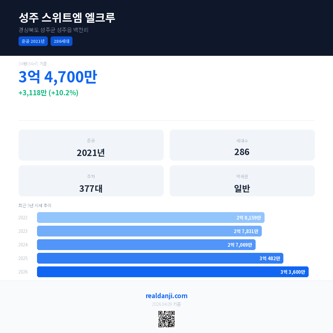 성주 스위트엠 엘크루 국민평형 기준 2026년 평균 거래가는 3억 3,600만으로, 전년 대비 10.2% 상승 했습니다.