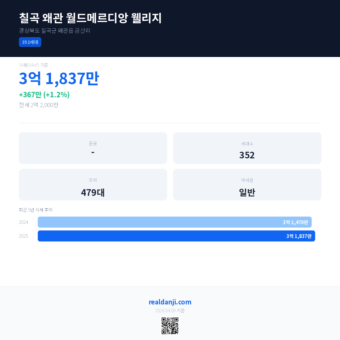 칠곡 왜관 월드메르디앙 웰리지 국민평형 기준 2025년 평균 거래가는 3억 1,837만으로, 전년 대비 1.2% 상승 했습니다.