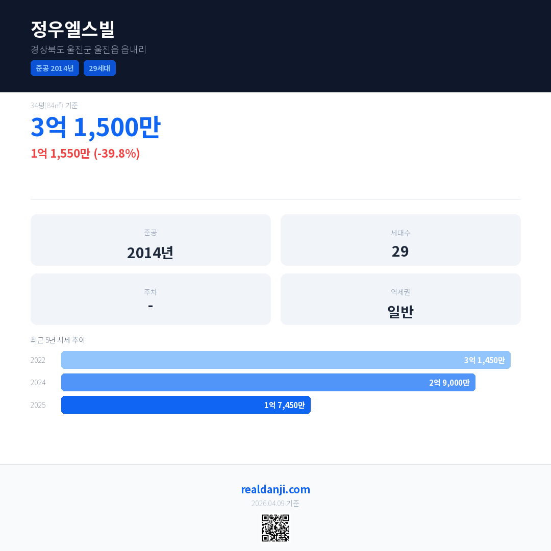정우엘스빌 국민평형 기준 2025년 평균 거래가는 1억 7,450만으로, 전년 대비 39.8% 하락 했습니다.