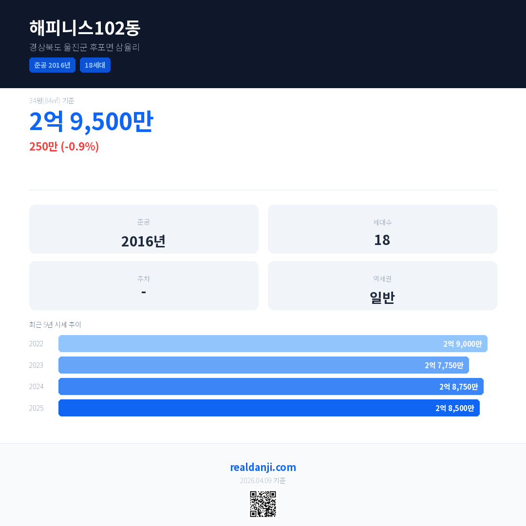 해피니스102동 국민평형 기준 2025년 평균 거래가는 2억 8,500만으로, 전년 대비 0.9% 하락 했습니다.