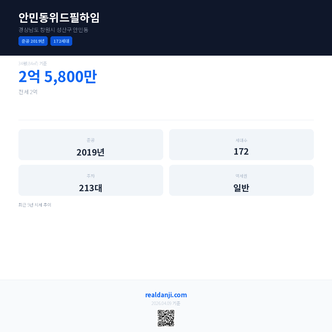 안민동위드필하임은(는) 2019년에 준공되었으며, 현재 7년차입니다. 총 172세대 규모입니다.