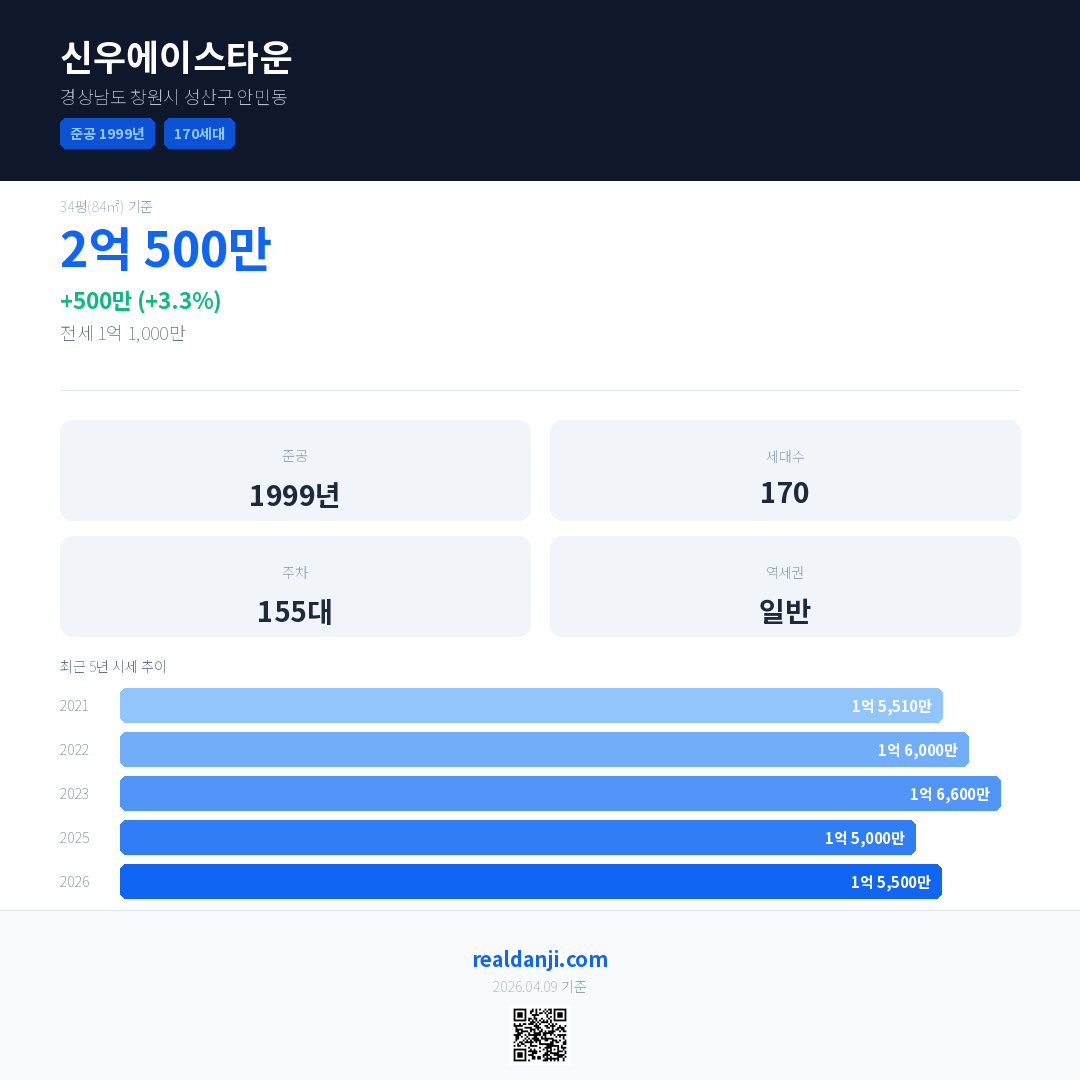 신우에이스타운 국민평형 기준 2026년 평균 거래가는 1억 5,500만으로, 전년 대비 3.3% 상승 했습니다.