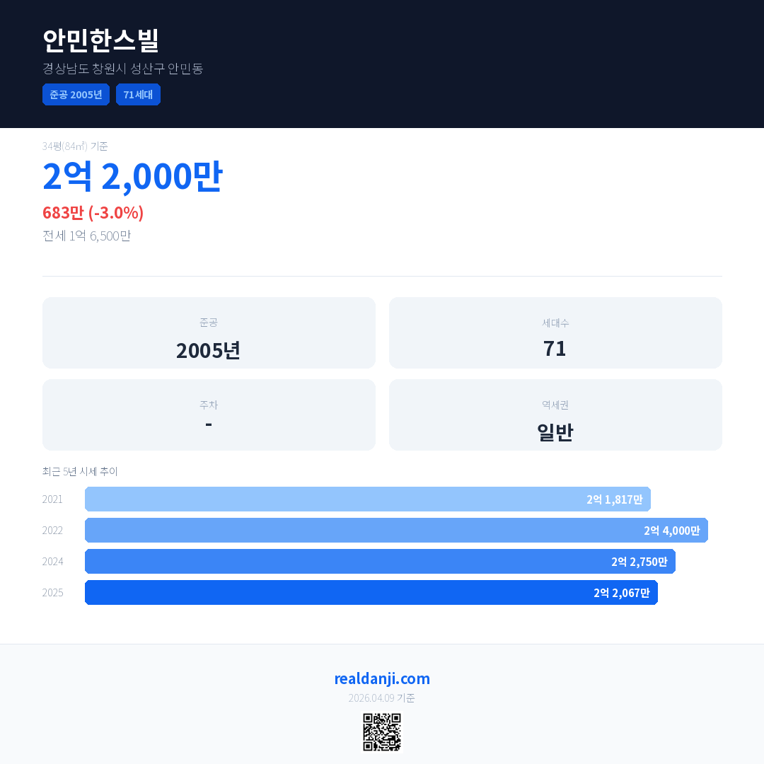 안민한스빌 국민평형 기준 2025년 평균 거래가는 2억 2,067만으로, 전년 대비 3.0% 하락 했습니다.