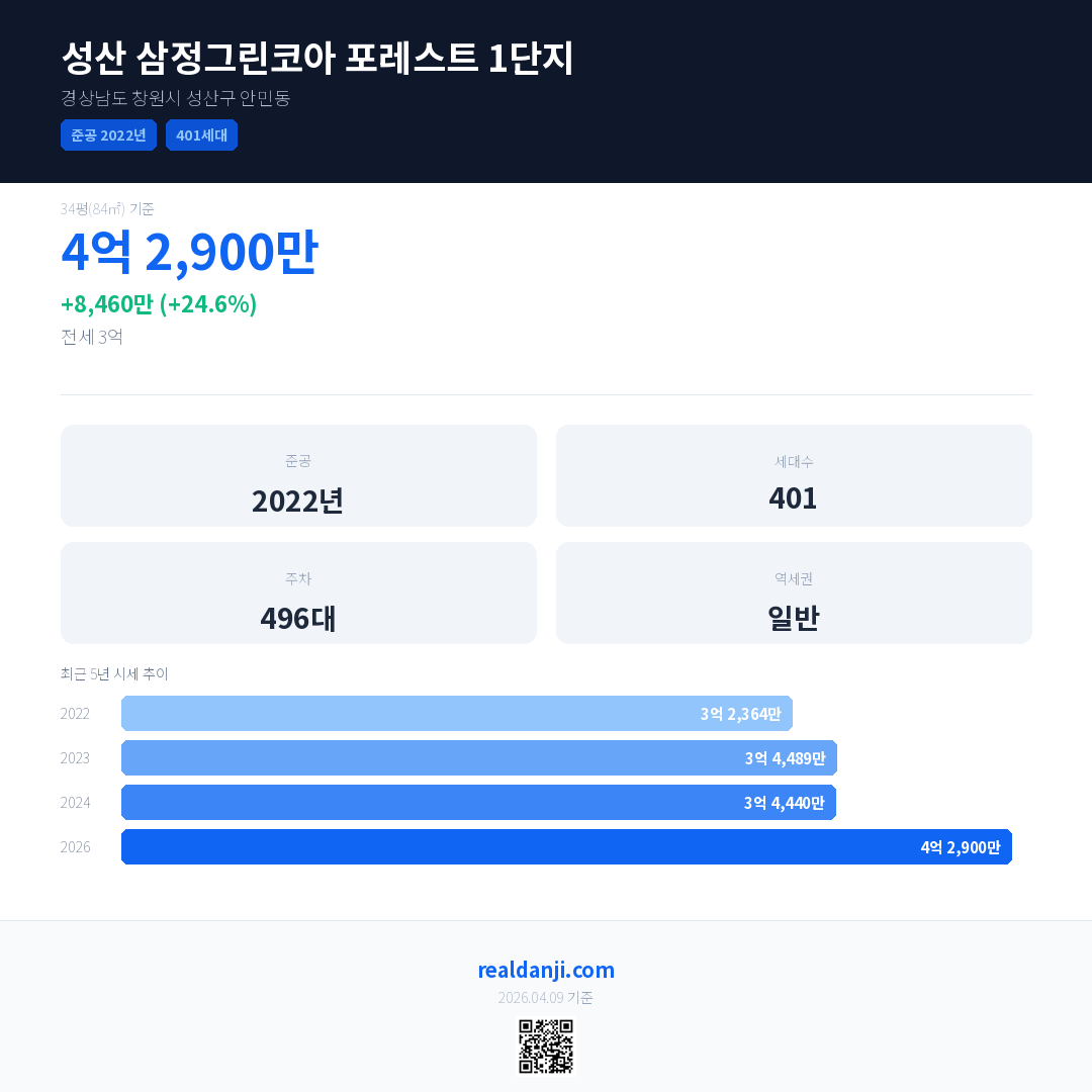 성산 삼정그린코아 포레스트 1단지 국민평형 기준 2026년 평균 거래가는 4억 2,900만으로, 전년 대비 24.6% 상승 했습니다.