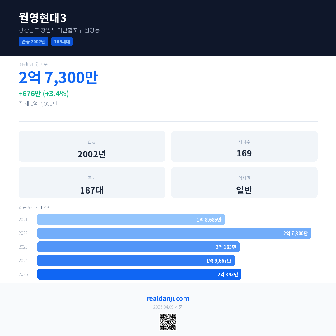 월영현대3 국민평형 기준 2025년 평균 거래가는 2억 343만으로, 전년 대비 3.4% 상승 했습니다.