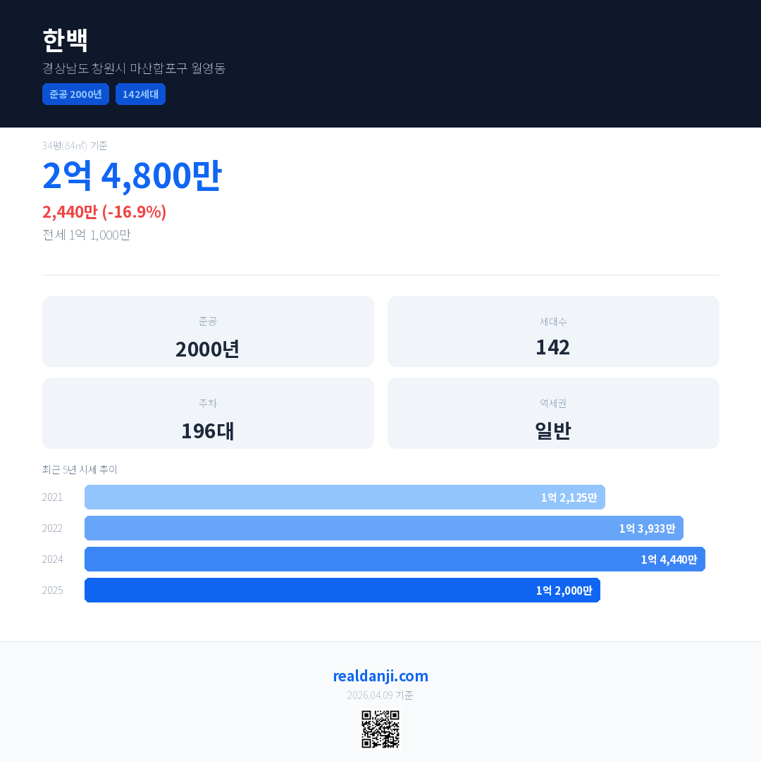 한백 국민평형 기준 2025년 평균 거래가는 1억 2,000만으로, 전년 대비 16.9% 하락 했습니다.