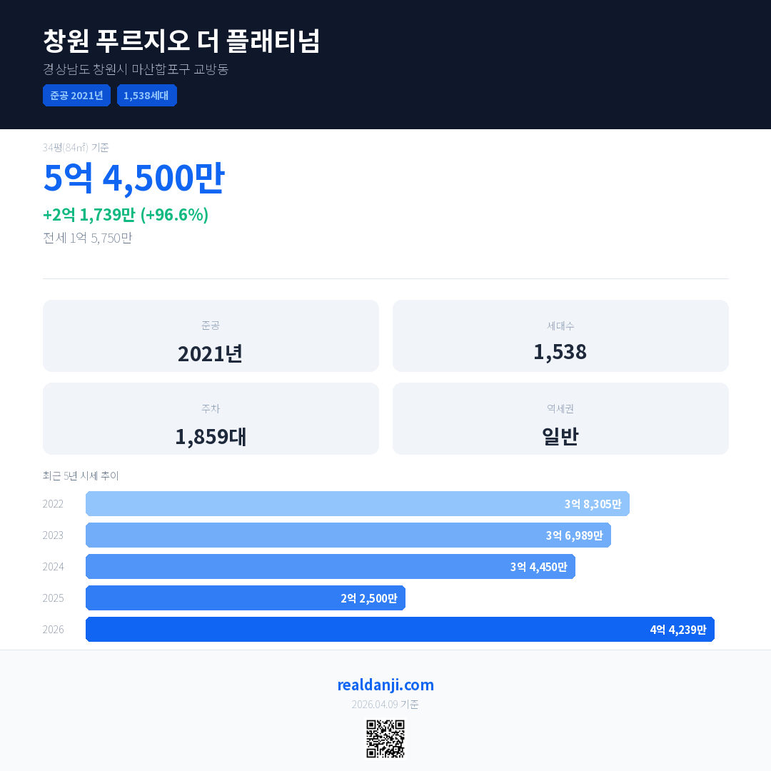 창원 푸르지오 더 플래티넘 국민평형 기준 2026년 평균 거래가는 4억 4,239만으로, 전년 대비 96.6% 상승 했습니다.