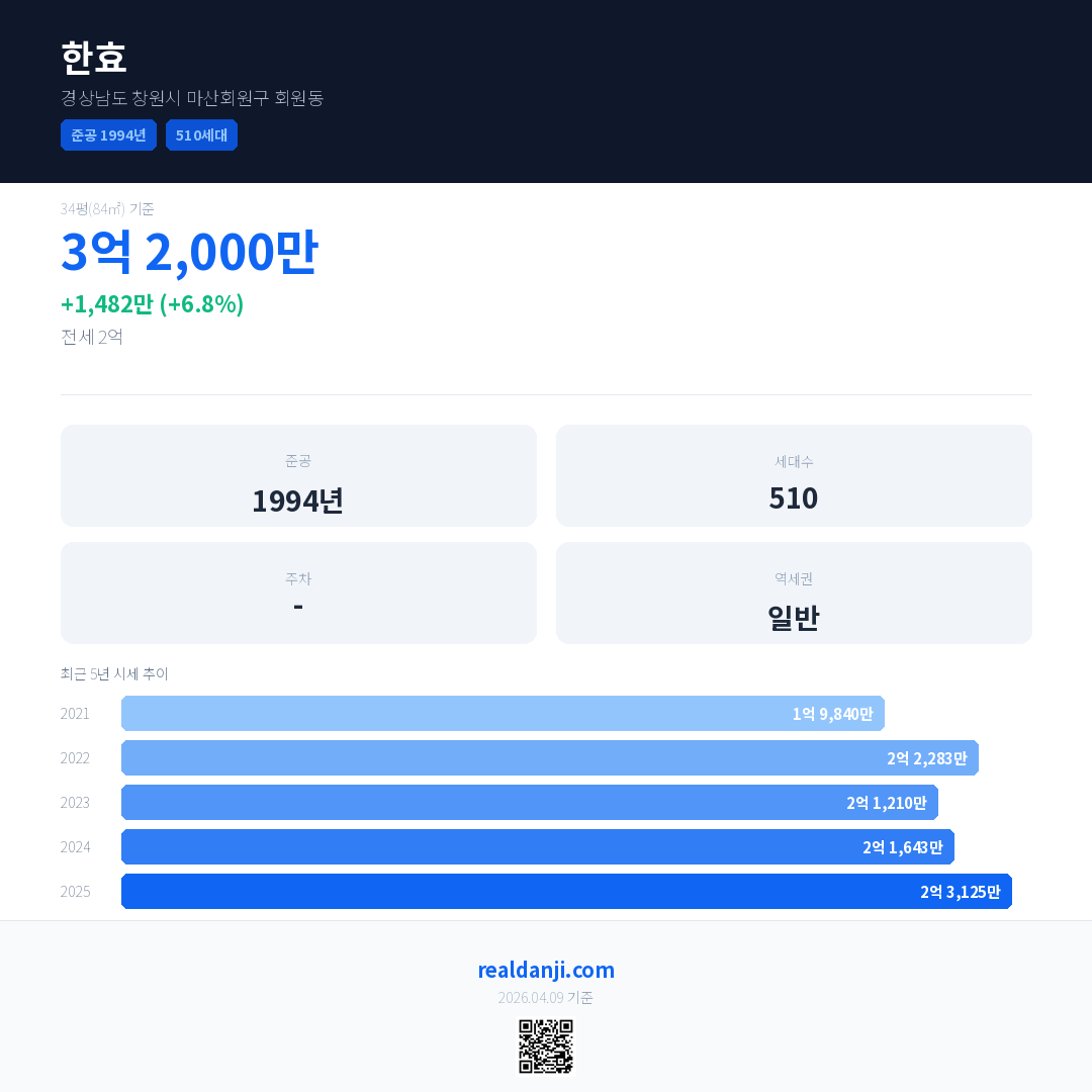 한효 국민평형 기준 2025년 평균 거래가는 2억 3,125만으로, 전년 대비 6.8% 상승 했습니다.