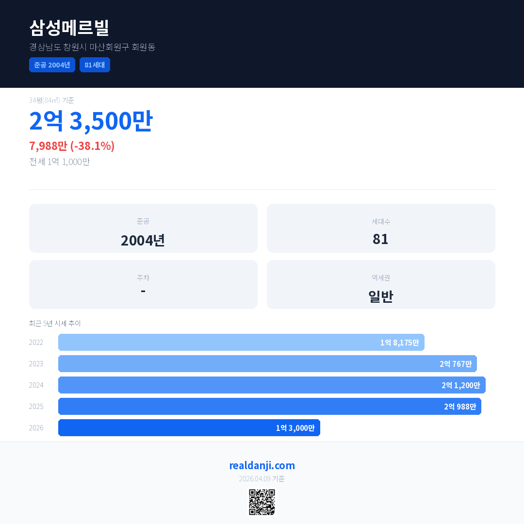 삼성메르빌 국민평형 기준 2026년 평균 거래가는 1억 3,000만으로, 전년 대비 38.1% 하락 했습니다.