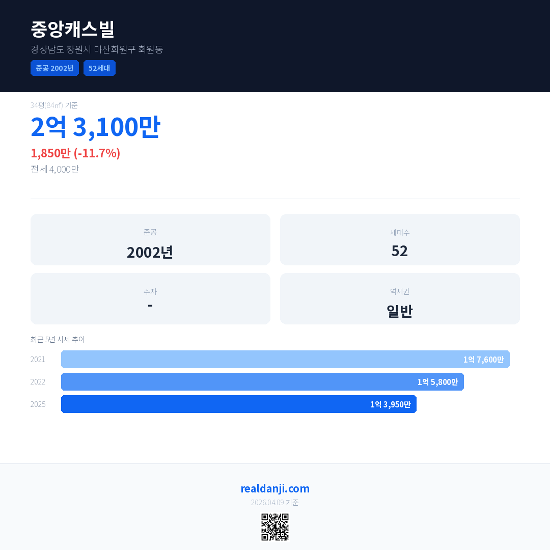 중앙캐스빌 국민평형 기준 2025년 평균 거래가는 1억 3,950만으로, 전년 대비 11.7% 하락 했습니다.