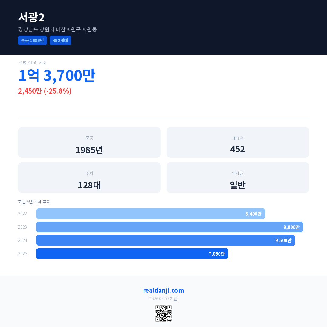 서광2 국민평형 기준 2025년 평균 거래가는 7,050만으로, 전년 대비 25.8% 하락 했습니다.