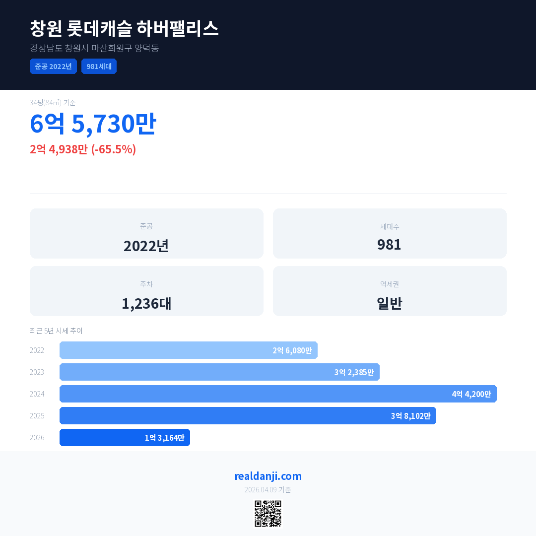 창원 롯데캐슬 하버팰리스 최근 거래가는 6억 5,730만입니다. (2026-02)