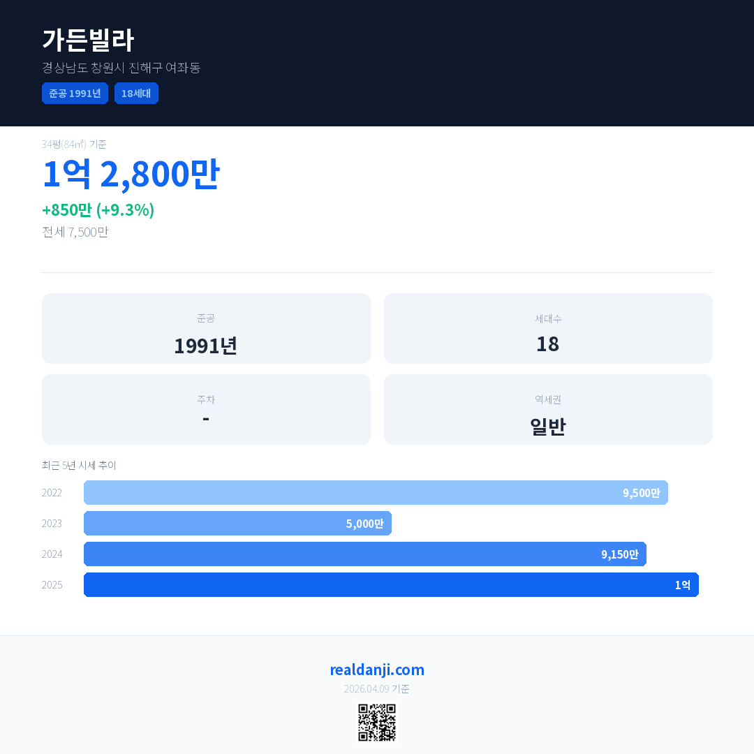 가든빌라 국민평형 기준 2025년 평균 거래가는 1억으로, 전년 대비 9.3% 상승 했습니다.