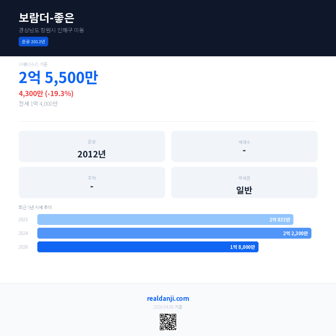보람더-좋은 국민평형 기준 2026년 평균 거래가는 1억 8,000만으로, 전년 대비 19.3% 하락 했습니다.
