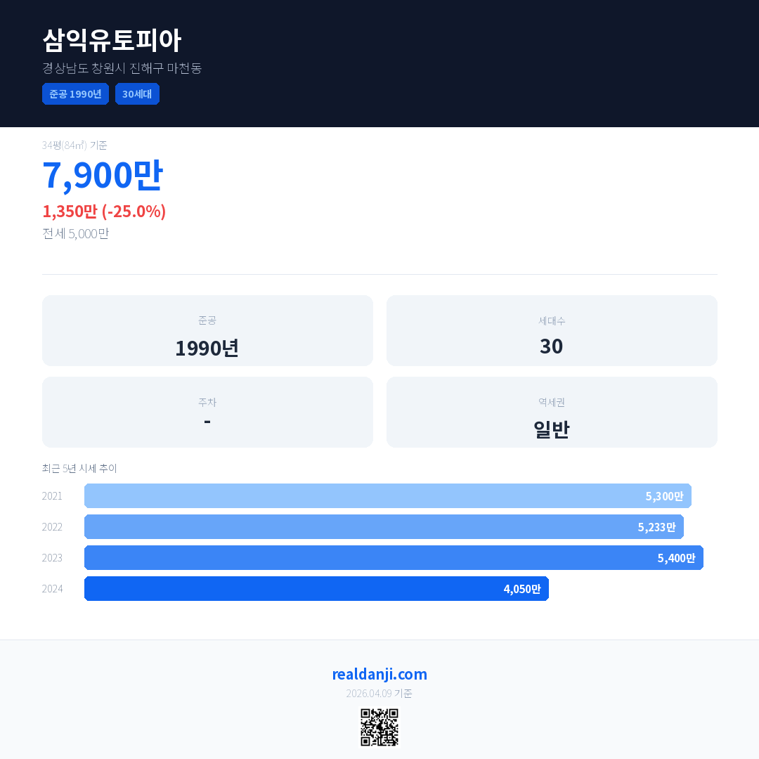 삼익유토피아 국민평형 기준 2024년 평균 거래가는 4,050만으로, 전년 대비 25.0% 하락 했습니다.