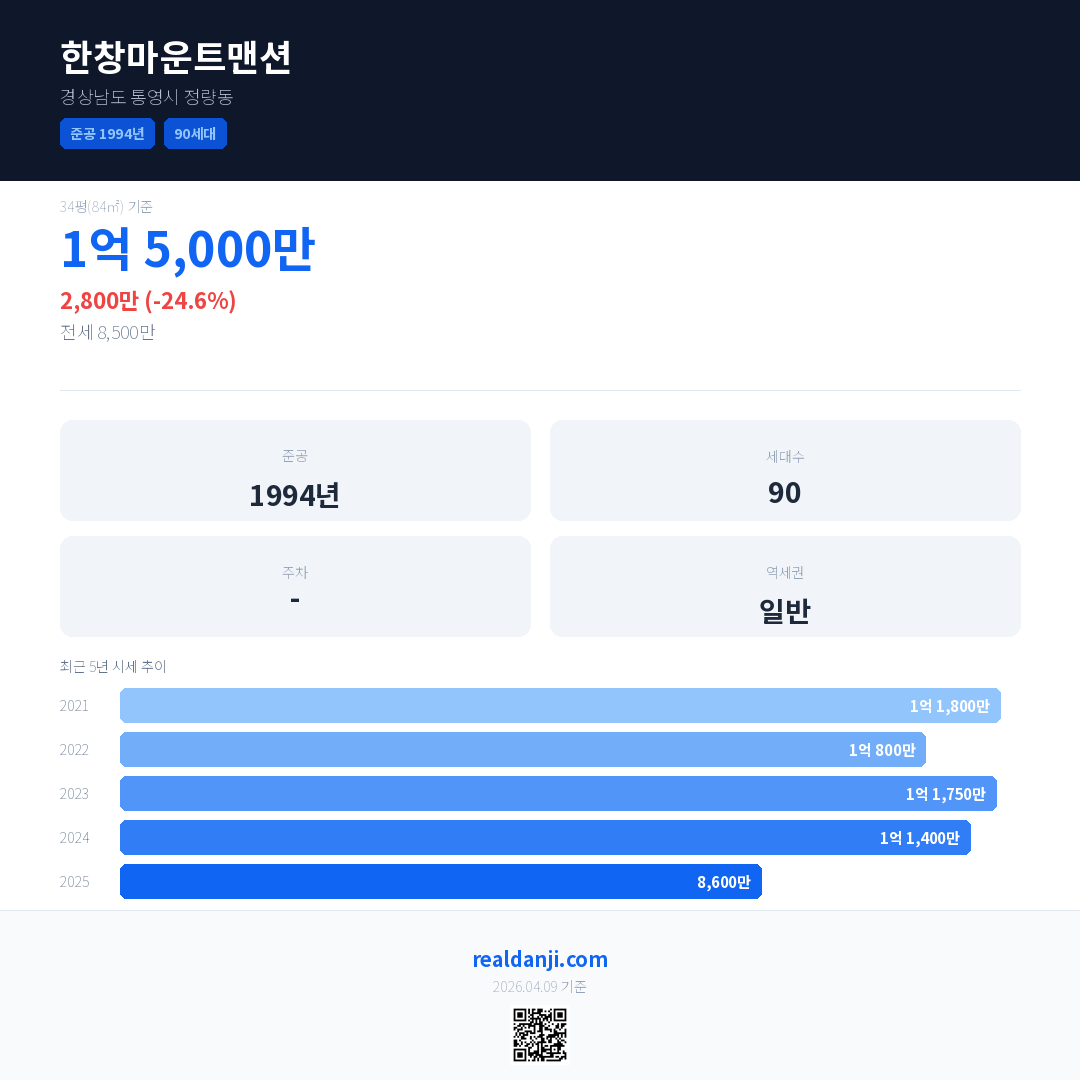 한창마운트맨션 국민평형 기준 2025년 평균 거래가는 8,600만으로, 전년 대비 24.6% 하락 했습니다.