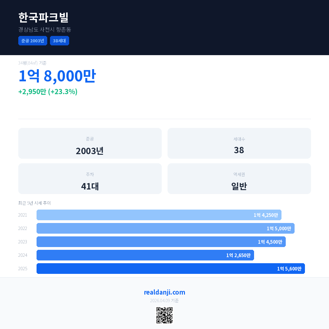 한국파크빌 국민평형 기준 2025년 평균 거래가는 1억 5,600만으로, 전년 대비 23.3% 상승 했습니다.