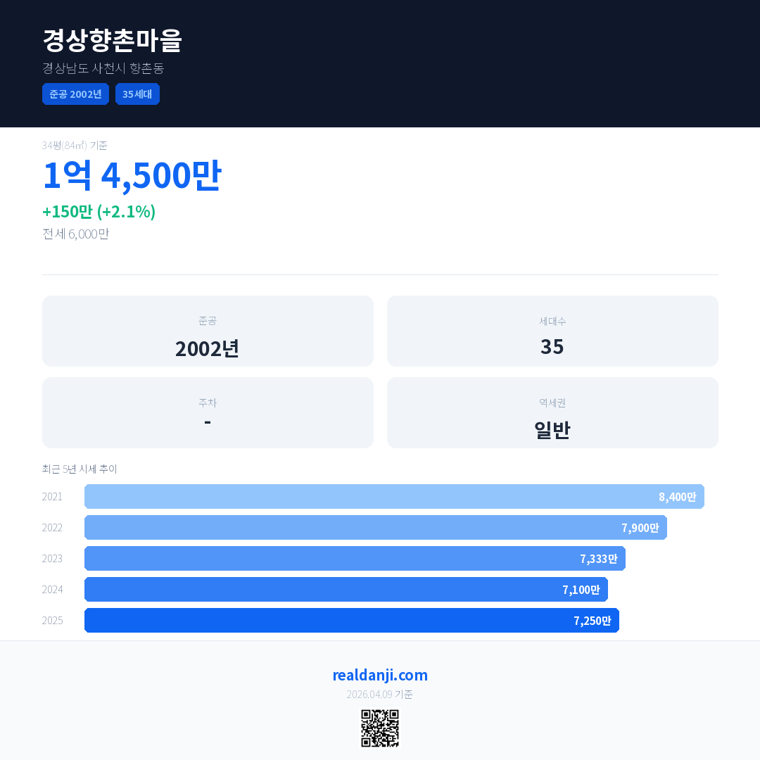 경상향촌마을 국민평형 기준 2025년 평균 거래가는 7,250만으로, 전년 대비 2.1% 상승 했습니다.
