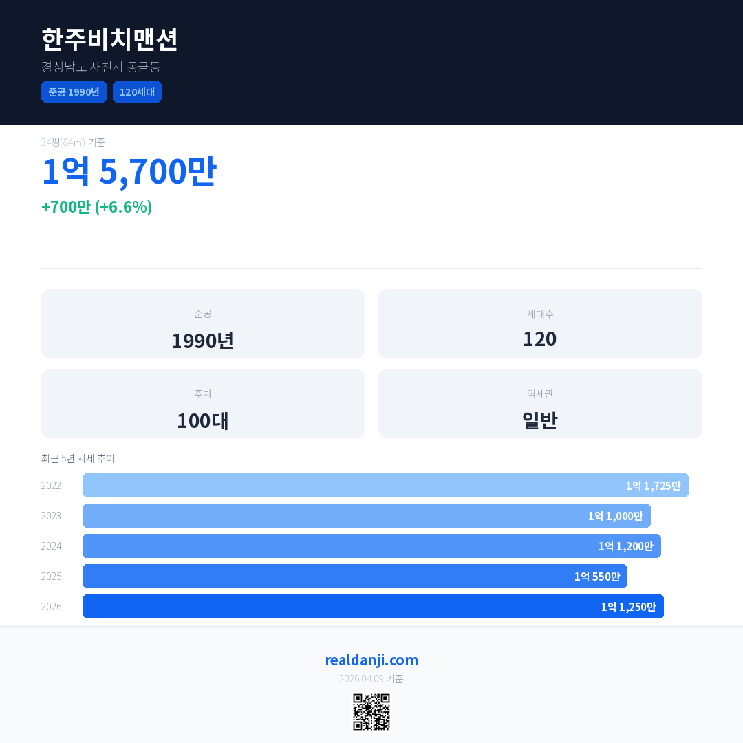 한주비치맨션 국민평형 기준 2026년 평균 거래가는 1억 1,250만으로, 전년 대비 6.6% 상승 했습니다.