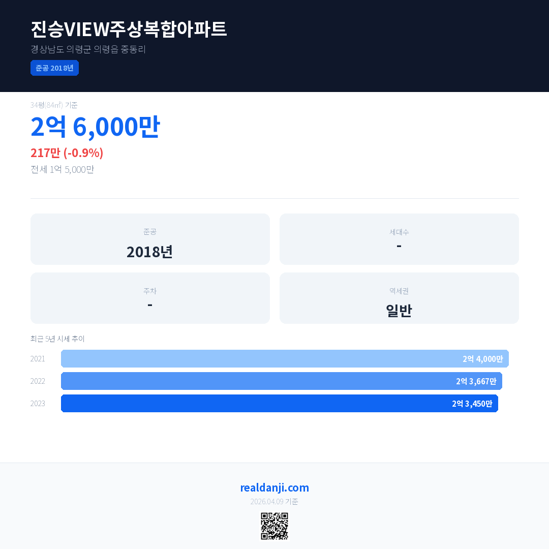 진승VIEW주상복합아파트 국민평형 기준 2023년 평균 거래가는 2억 3,450만으로, 전년 대비 0.9% 하락 했습니다.