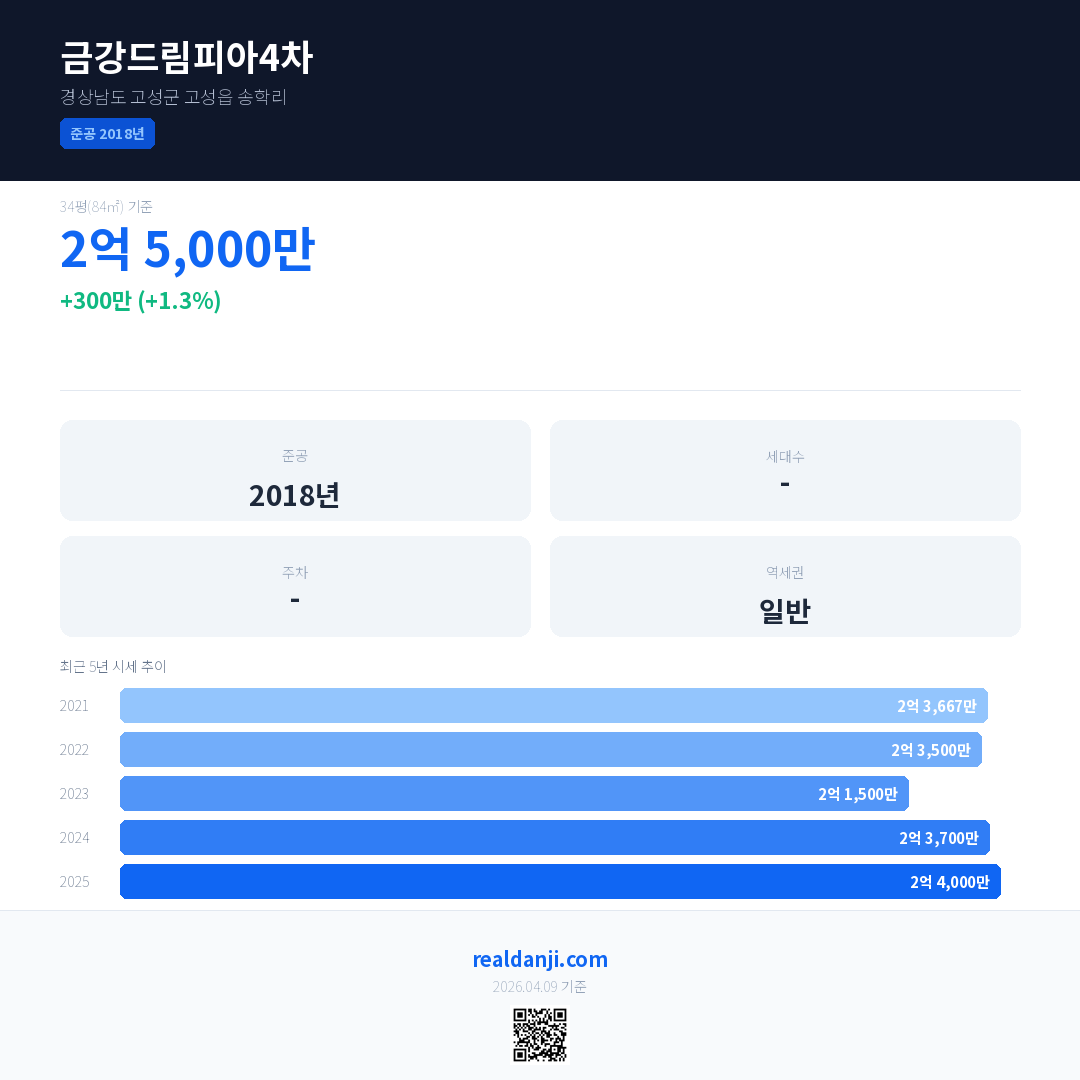 금강드림피아4차 국민평형 기준 2025년 평균 거래가는 2억 4,000만으로, 전년 대비 1.3% 상승 했습니다.