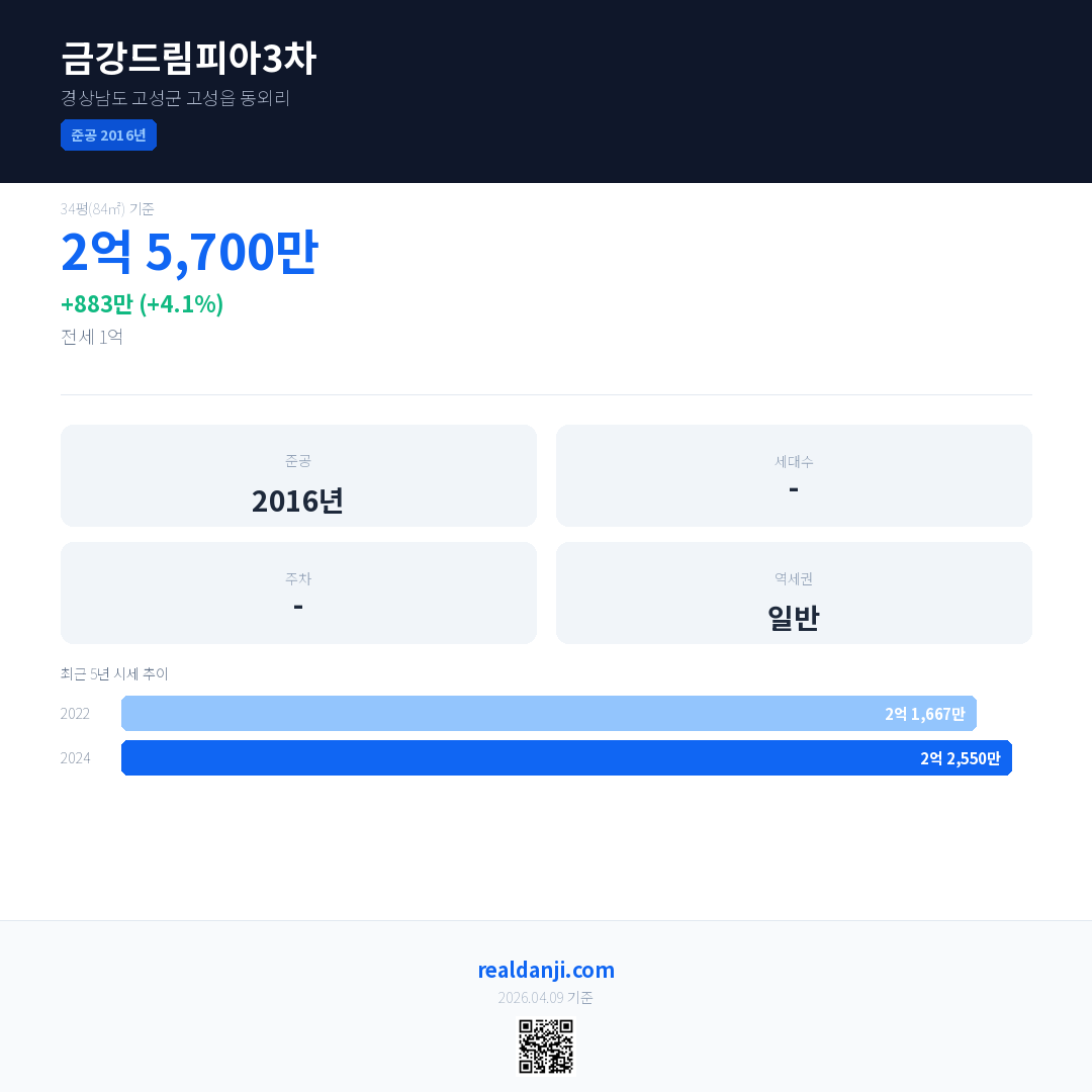 금강드림피아3차은(는) 2016년에 준공되었으며, 현재 10년차입니다.