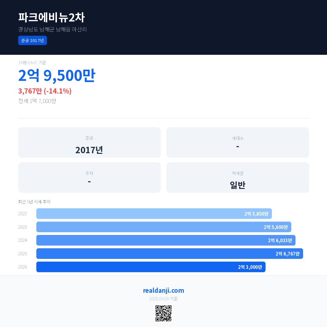 파크에비뉴2차 국민평형 기준 2026년 평균 거래가는 2억 3,000만으로, 전년 대비 14.1% 하락 했습니다.