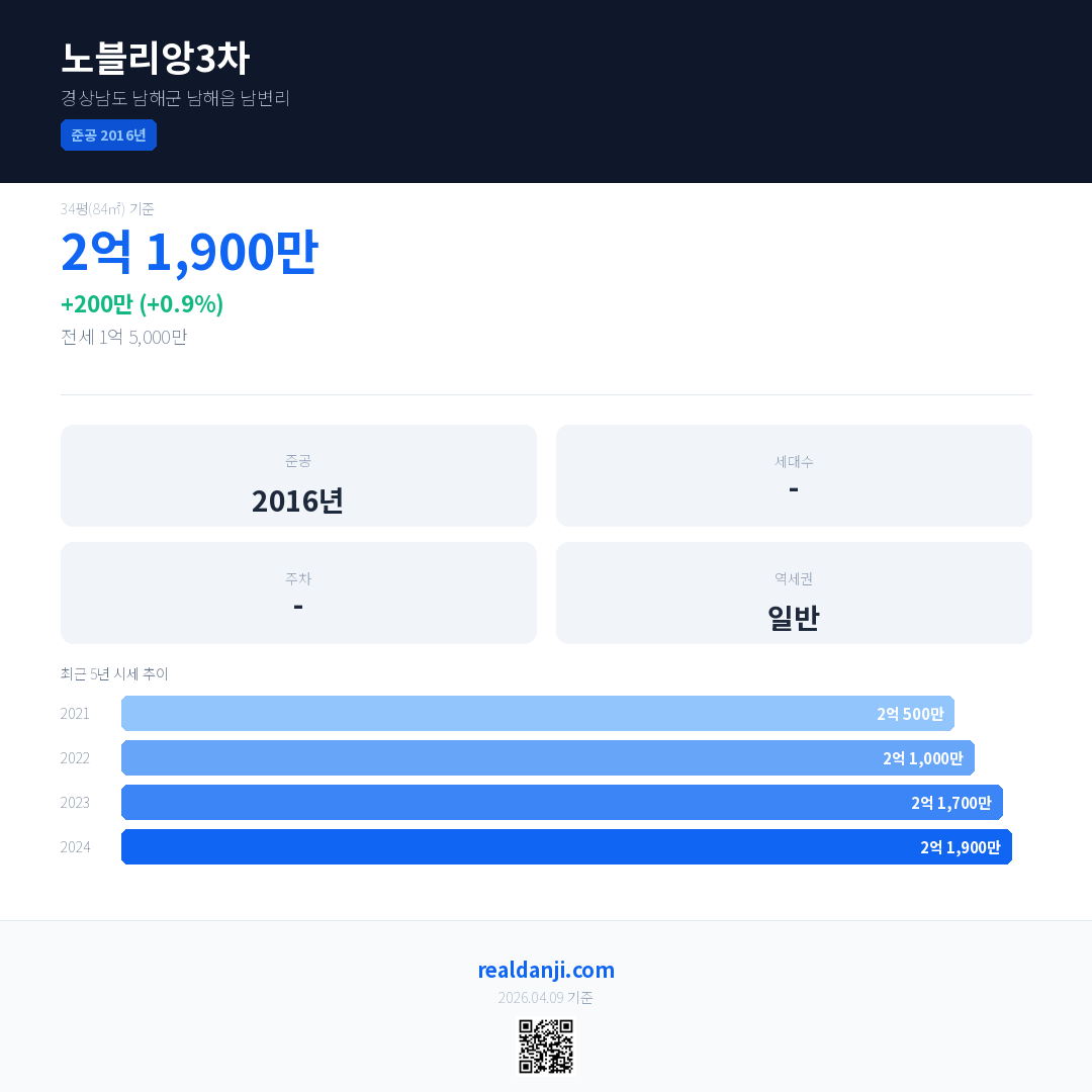 노블리앙3차 최근 거래가는 2억 1,900만입니다. (2024-04)