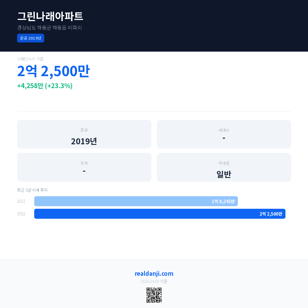 그린나래아파트 국민평형 기준 2022년 평균 거래가는 2억 2,500만으로, 전년 대비 23.3% 상승 했습니다.
