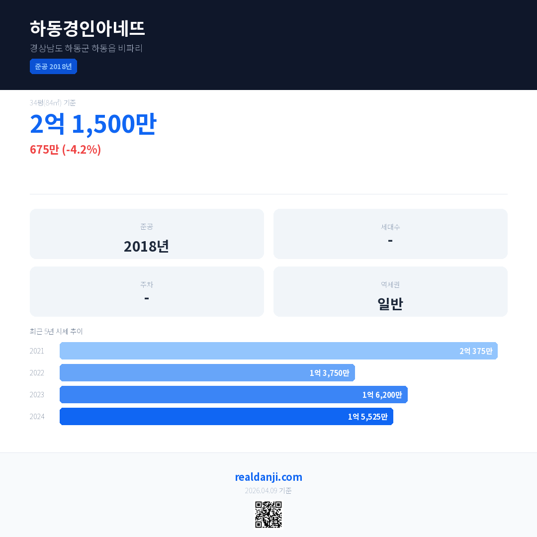 하동경인아네뜨 국민평형 기준 2024년 평균 거래가는 1억 5,525만으로, 전년 대비 4.2% 하락 했습니다.