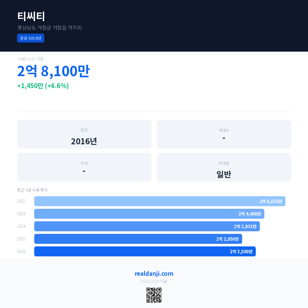 티씨티 국민평형 기준 2026년 평균 거래가는 2억 3,500만으로, 전년 대비 6.6% 상승 했습니다.