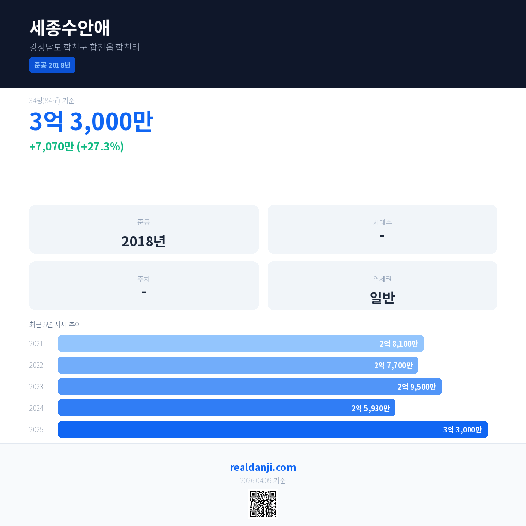 세종수안애 국민평형 기준 2025년 평균 거래가는 3억 3,000만으로, 전년 대비 27.3% 상승 했습니다.