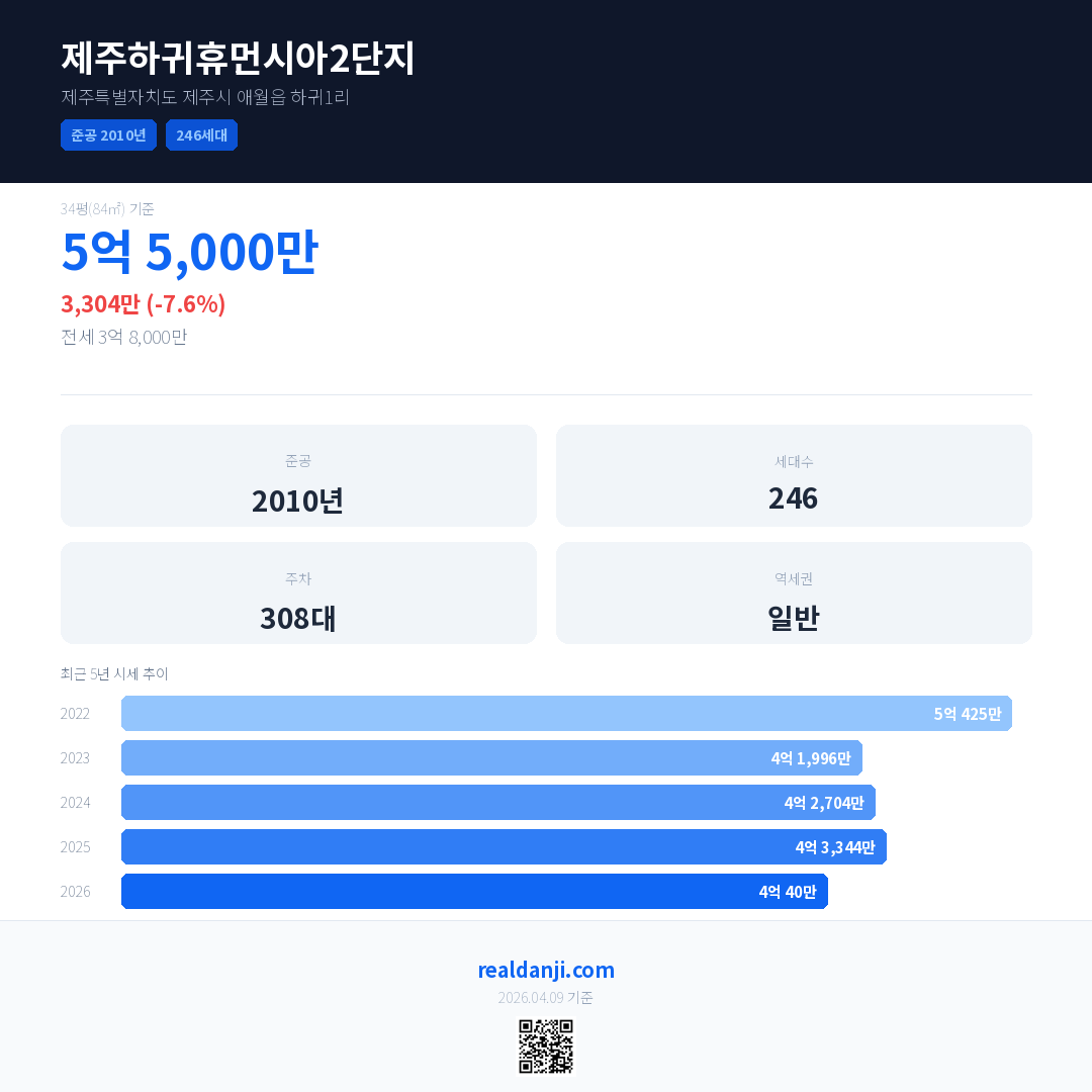 제주하귀휴먼시아2단지 국민평형 기준 2026년 평균 거래가는 4억 40만으로, 전년 대비 7.6% 하락 했습니다.