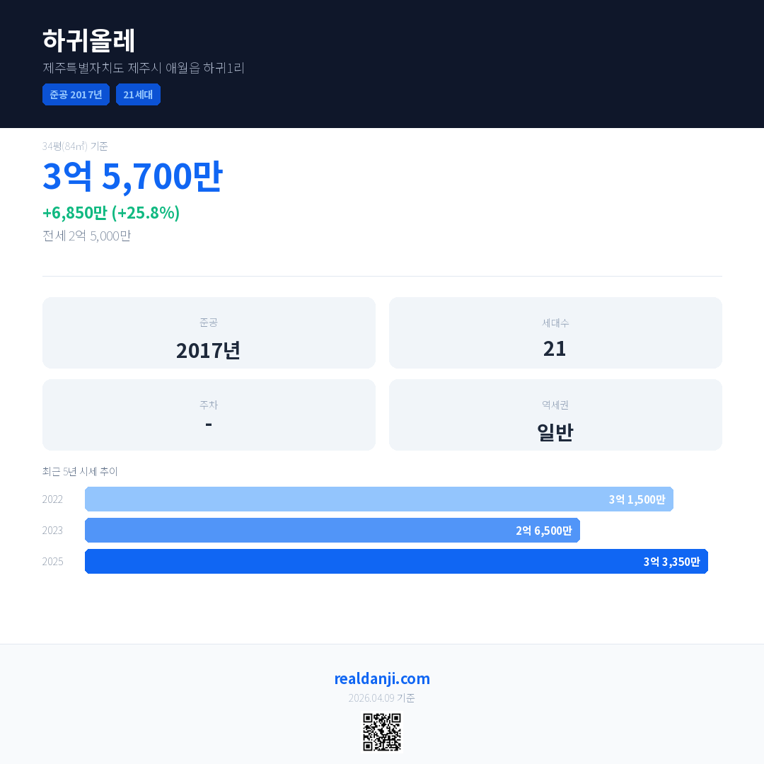 하귀올레 국민평형 기준 2025년 평균 거래가는 3억 3,350만으로, 전년 대비 25.8% 상승 했습니다.