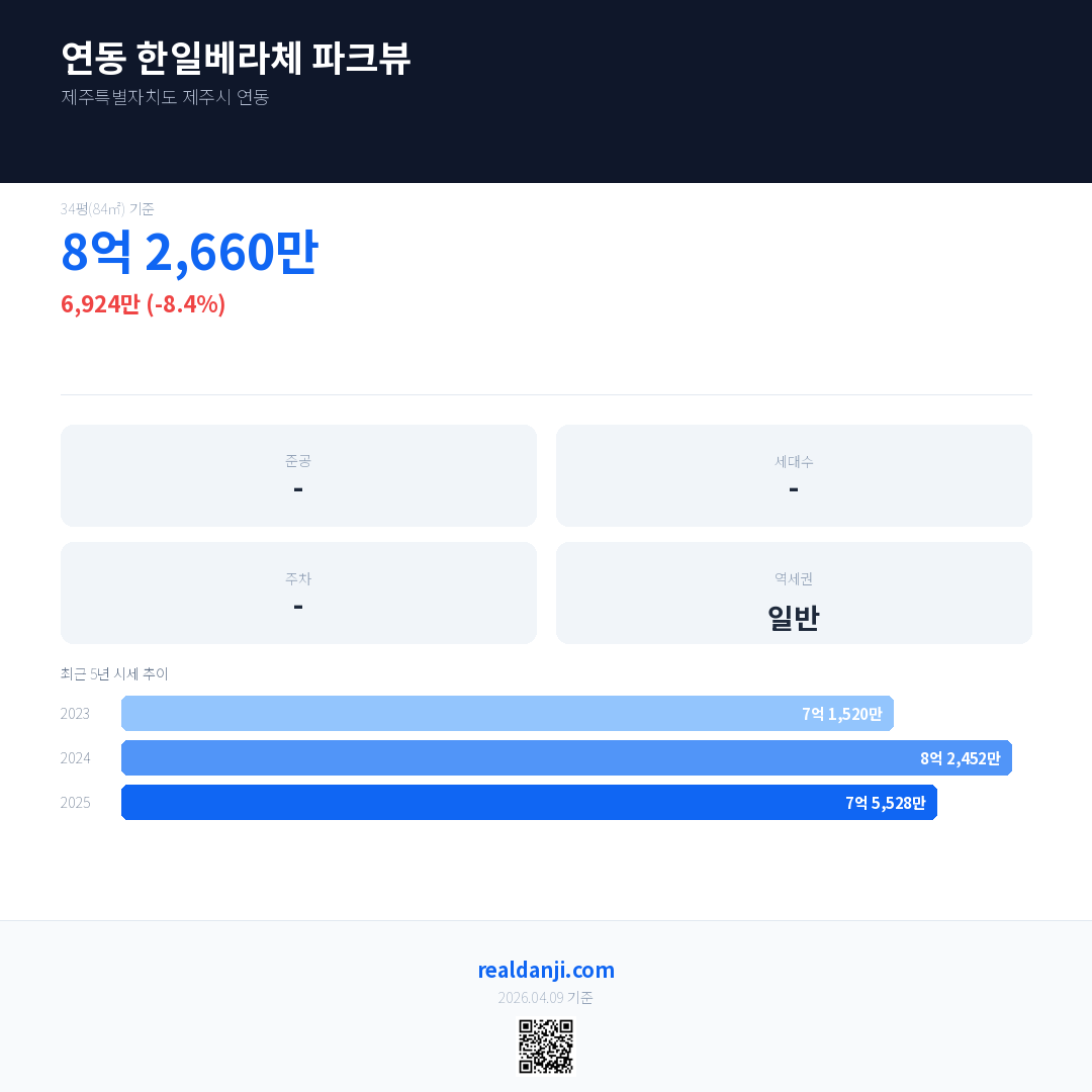 연동 한일베라체 파크뷰 국민평형 기준 2025년 평균 거래가는 7억 5,528만으로, 전년 대비 8.4% 하락 했습니다.