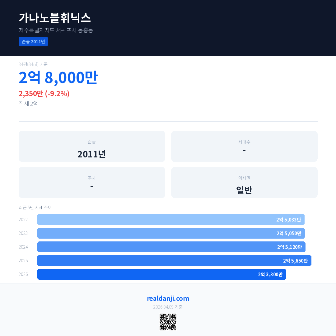 가나노블휘닉스 국민평형 기준 2026년 평균 거래가는 2억 3,300만으로, 전년 대비 9.2% 하락 했습니다.