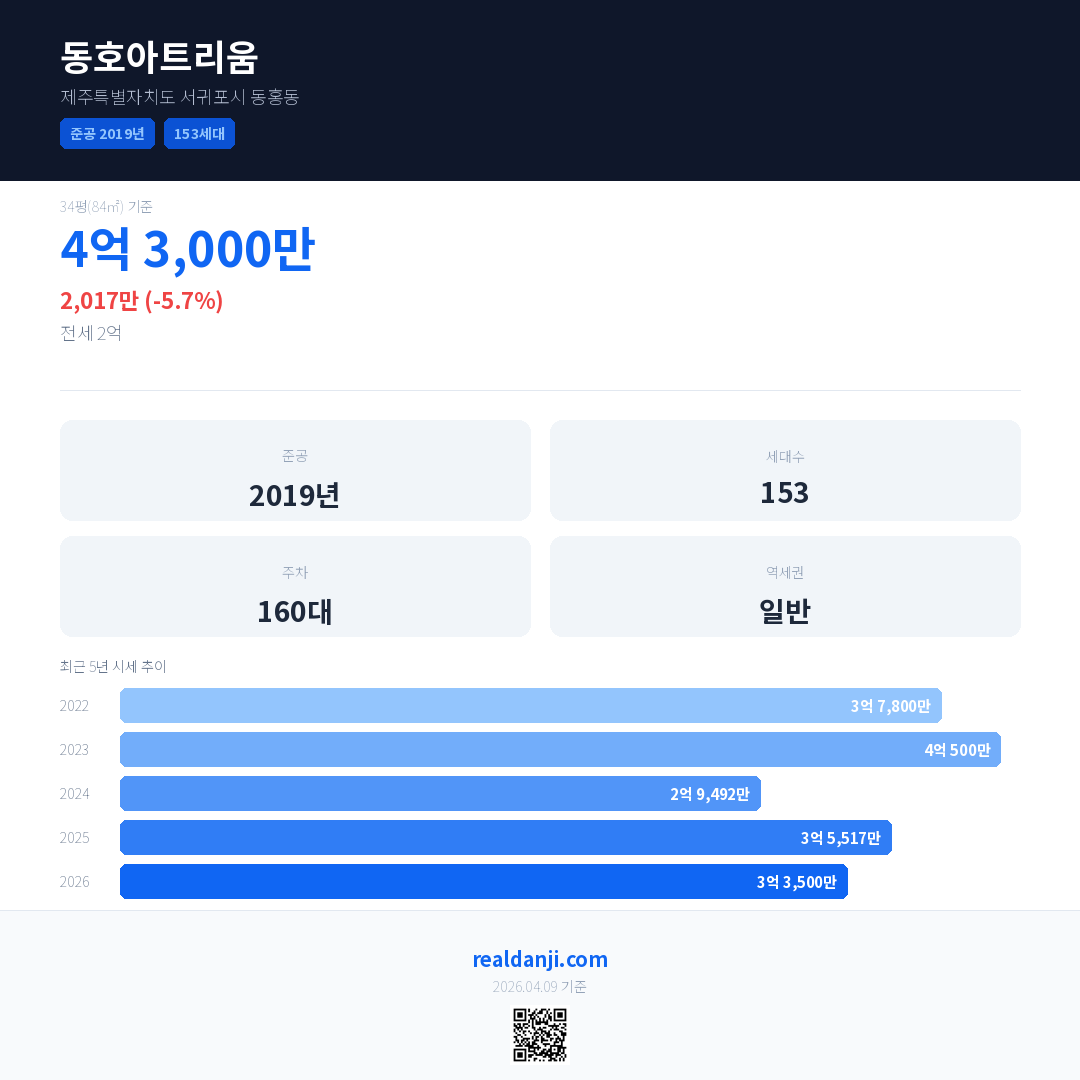 동호아트리움 국민평형 기준 2026년 평균 거래가는 3억 3,500만으로, 전년 대비 5.7% 하락 했습니다.