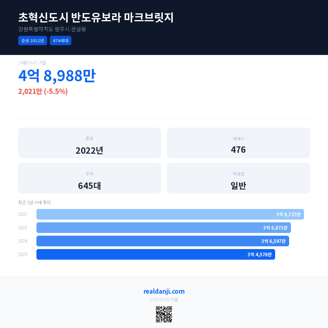 초혁신도시 반도유보라 마크브릿지 국민평형 기준 2025년 평균 거래가는 3억 4,576만으로, 전년 대비 5.5% 하락 했습니다.