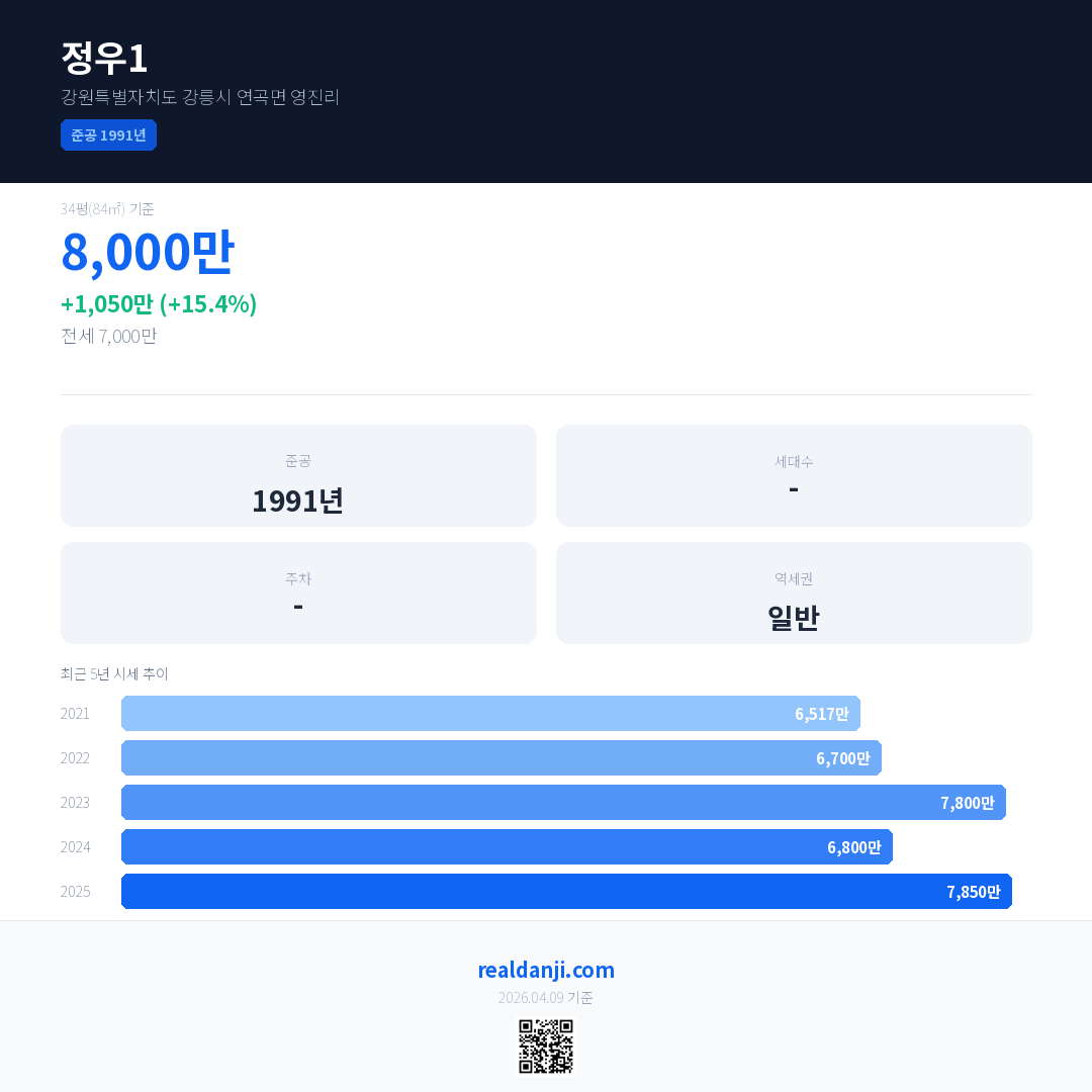 정우1 국민평형 기준 2025년 평균 거래가는 7,850만으로, 전년 대비 15.4% 상승 했습니다.