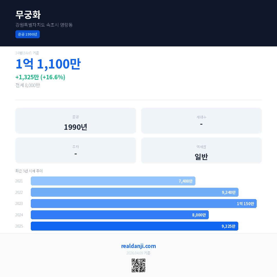 무궁화 국민평형 기준 2025년 평균 거래가는 9,325만으로, 전년 대비 16.6% 상승 했습니다.