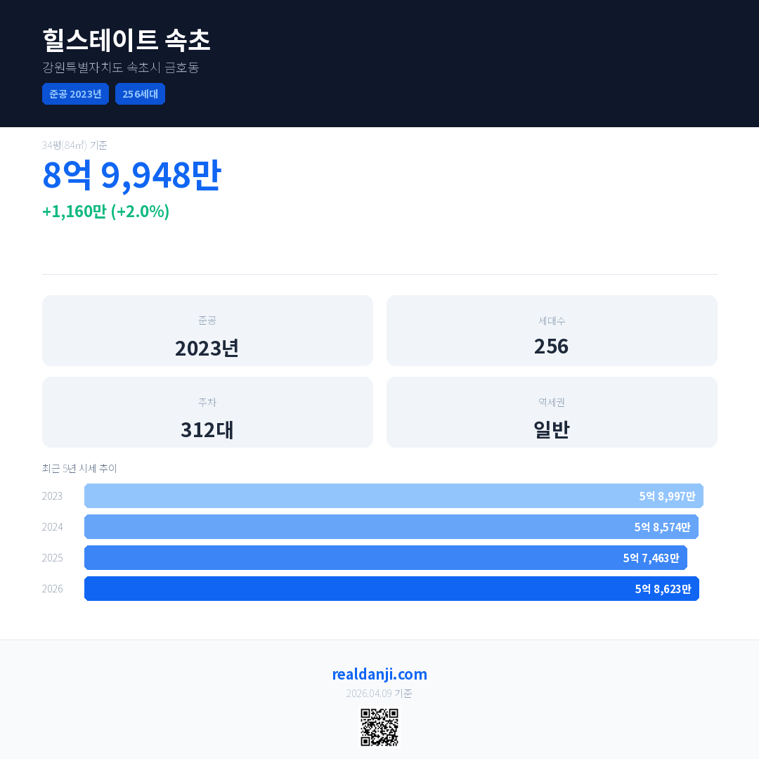 힐스테이트 속초 국민평형 기준 2026년 평균 거래가는 5억 8,623만으로, 전년 대비 2.0% 상승 했습니다.