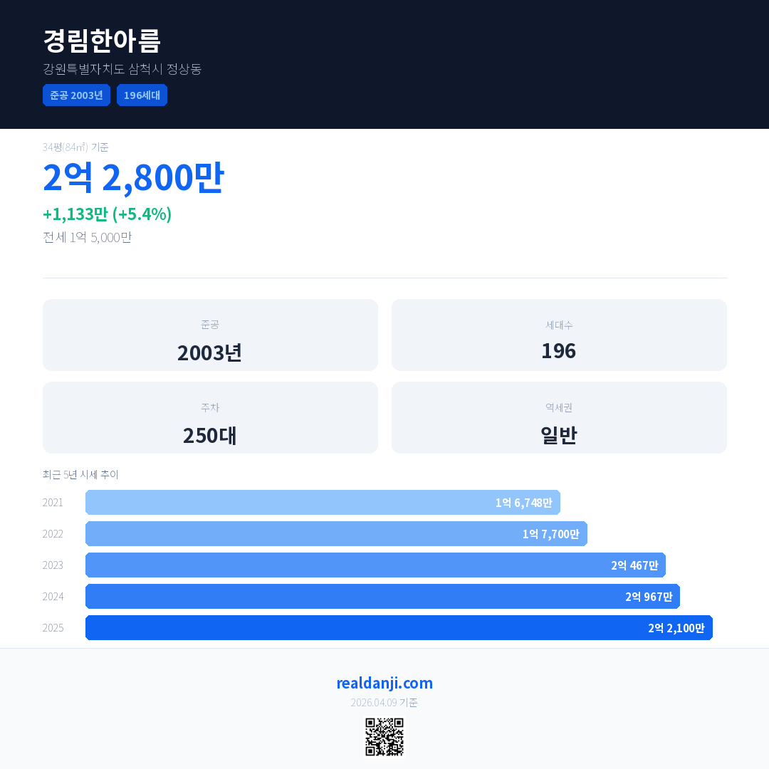 경림한아름 국민평형 기준 2025년 평균 거래가는 2억 2,100만으로, 전년 대비 5.4% 상승 했습니다.