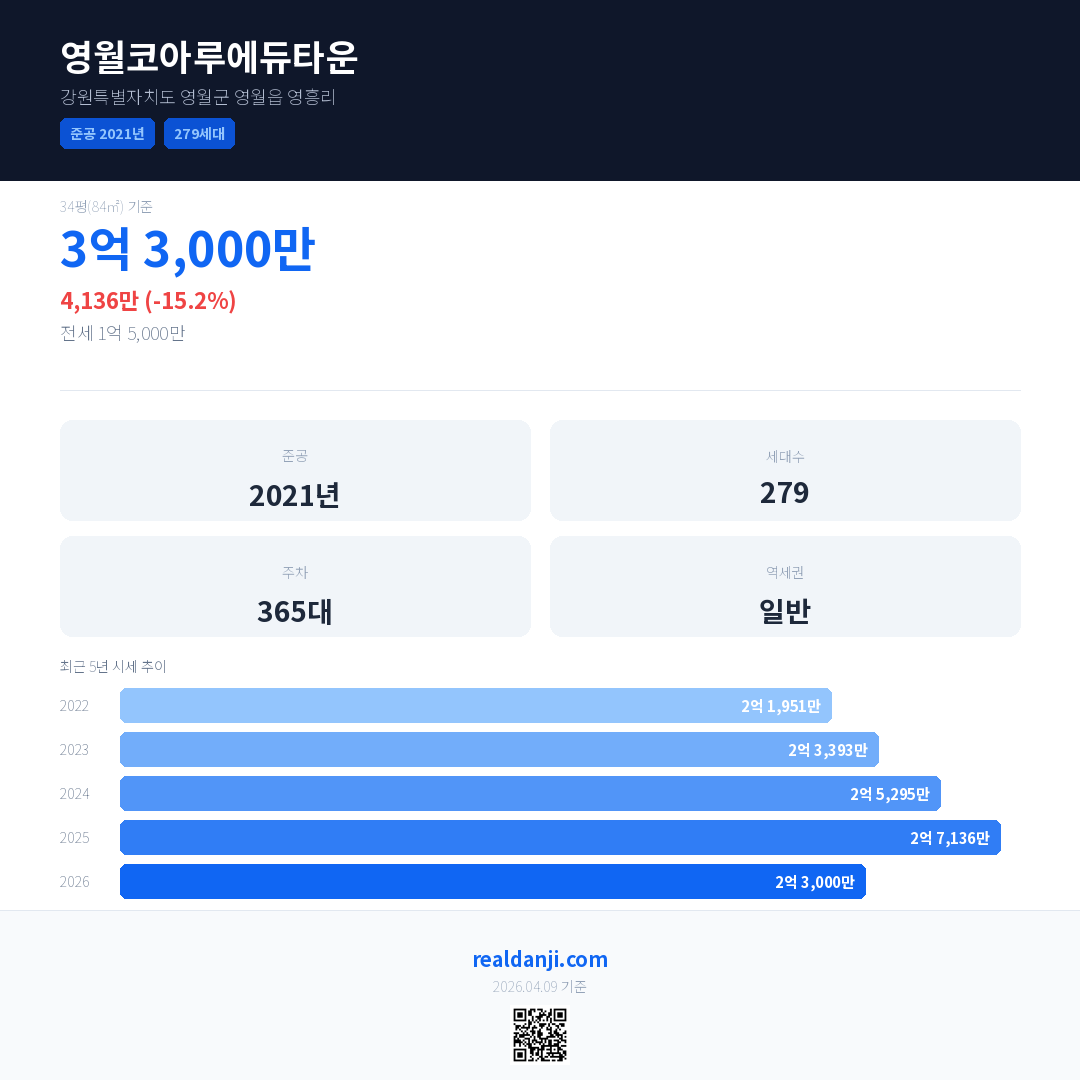 영월코아루에듀타운 최근 거래가는 3억 3,000만입니다. (2026-03)