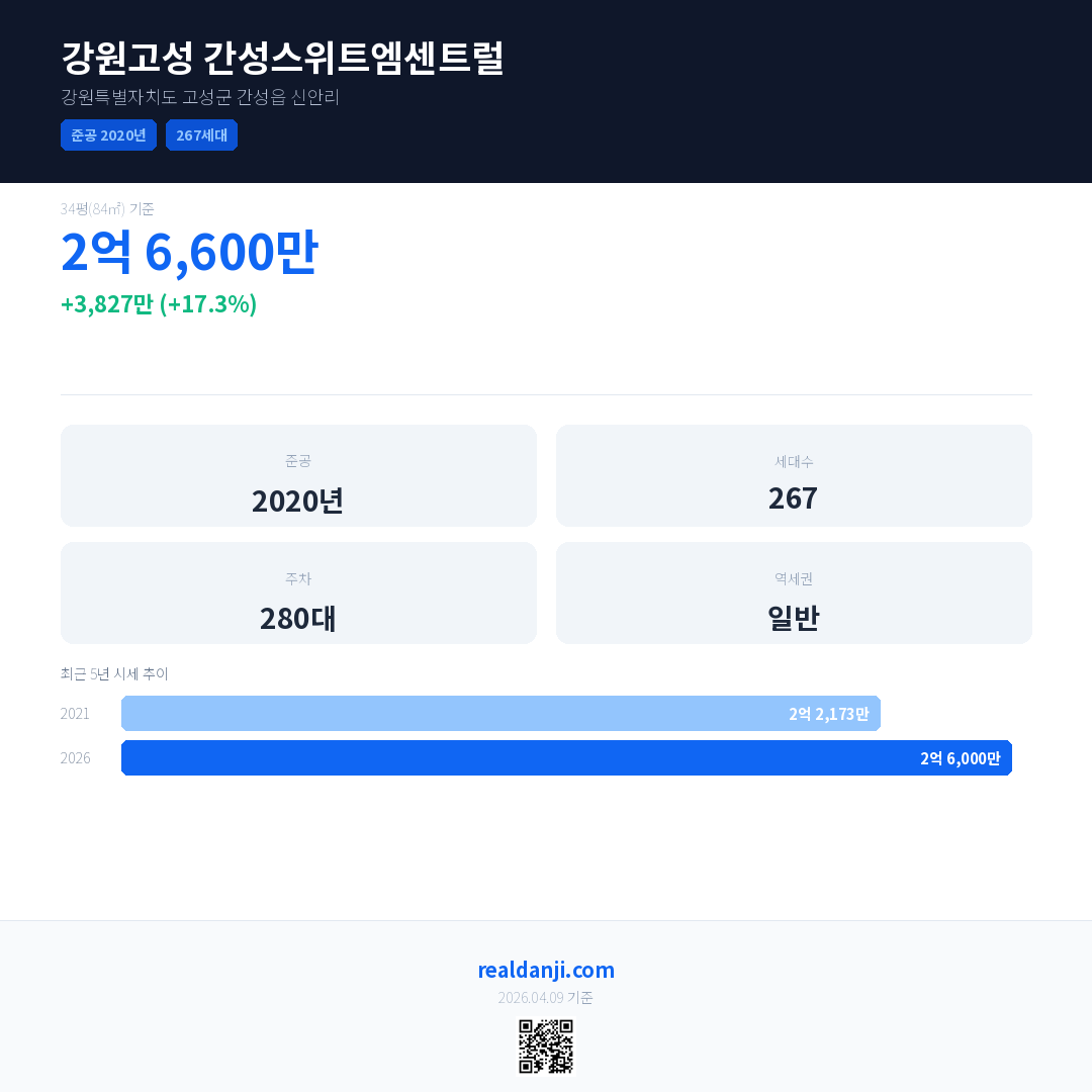 강원고성 간성스위트엠센트럴 국민평형 기준 2026년 평균 거래가는 2억 6,000만으로, 전년 대비 17.3% 상승 했습니다.